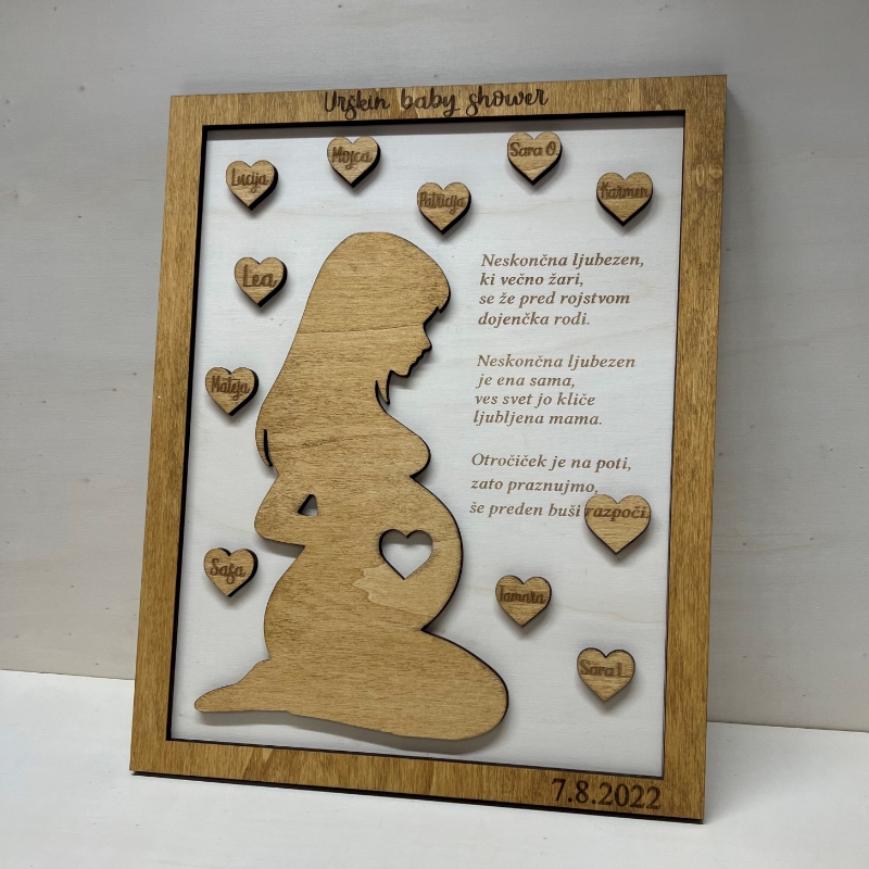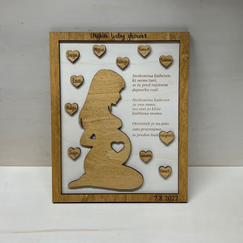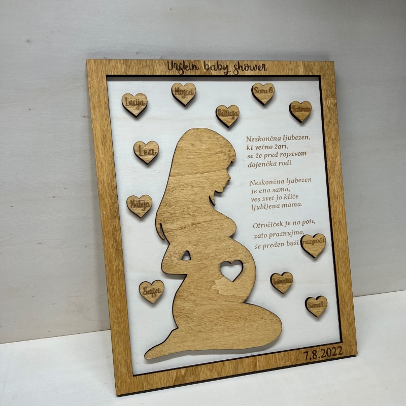 Ta čudovit leseni okvir je popolno darilo za baby shower, saj predstavlja edinstven spomin na posebne trenutke pričakovanja novega člana družine. Izdelek je skrbno izrezan in graviran iz kakovostnega lesa, na njem pa so vgravirana imena bližnjih oseb, ki bodo otroka in mamico obdajale z ljubeznijo. Nežen dizajn s silhueto nosečnice, izrezanimi srčki in čudovitim besedilom dodaja pridih elegance in topline.