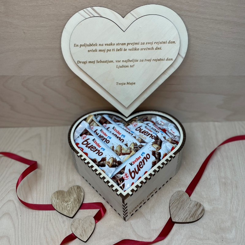 Leseni srček s čokoladicami je ročno izdelan dekorativni izdelek, primeren kot darilo za rojstni dan, obletnico ali posebno priložnost. Elegantna lesena škatla v obliki srca skriva sladko presenečenje, ki ga prilagodimo vašim željam.