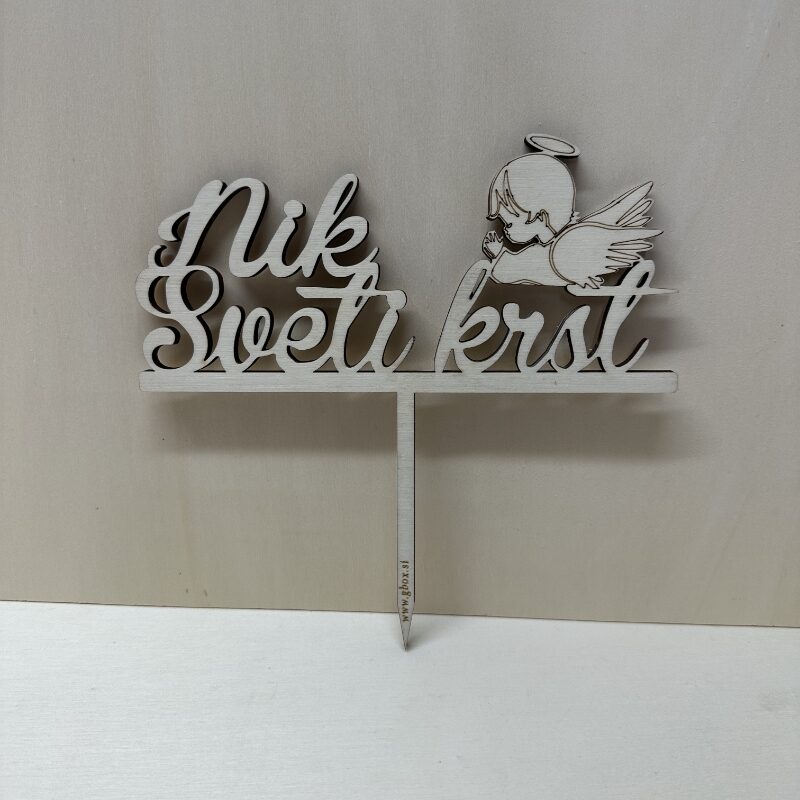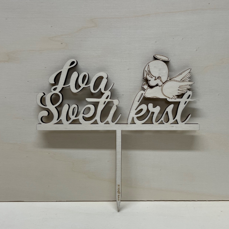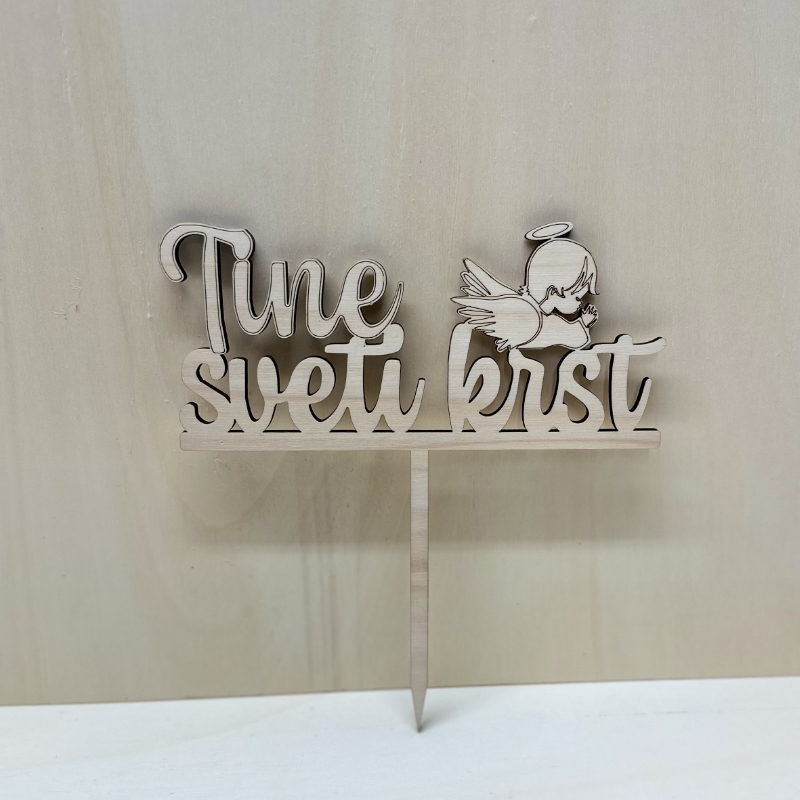 Čudovit personaliziran leseni toper z imenom in motivom angelčka je popoln dodatek za krstno torto.