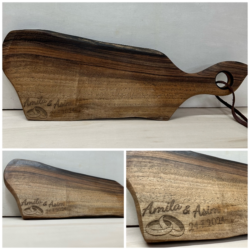Ponujamo storitev personalizirane laserske gravure na vaših lesenih izdelkih. Na fotografiji je primer gravure na leseni deski, ki jo je prinesla stranka. V tem primeru smo vgravirali imeni skupaj z datumom in motivom poročnih prstanov. Naša gravura je natančna in trajna, primerna za različne priložnosti, kot so poroke, obletnice, rojstni dnevi ali darila.