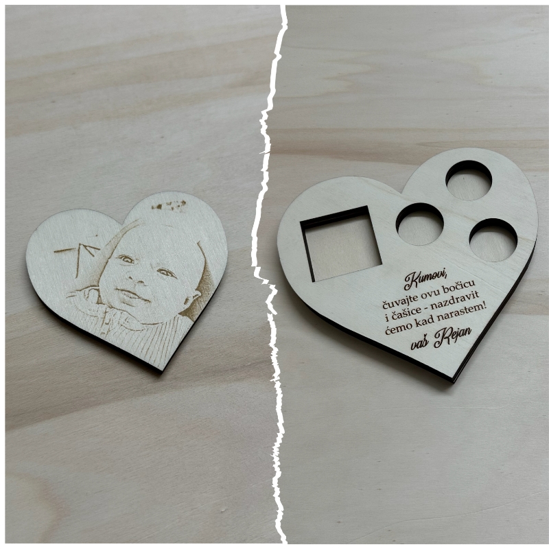Unikatni lesen komplet je popolno darilo za botre, starše ali posebne življenjske trenutke, kot so krst, birmo ali rojstvo otroka. Personaliziran podstavek vsebuje izreze za stekleničko in 3 kozarce, priložena pa je tudi gravirana slikica v obliki srca, ki se obesi okoli stekleničke in tako doda še poseben čustveni pečat.