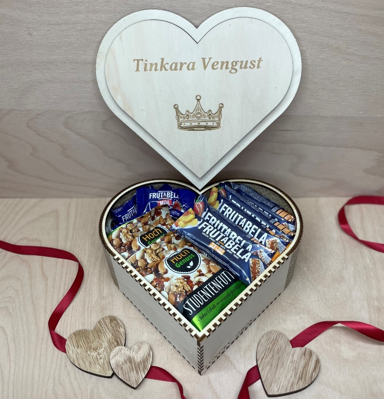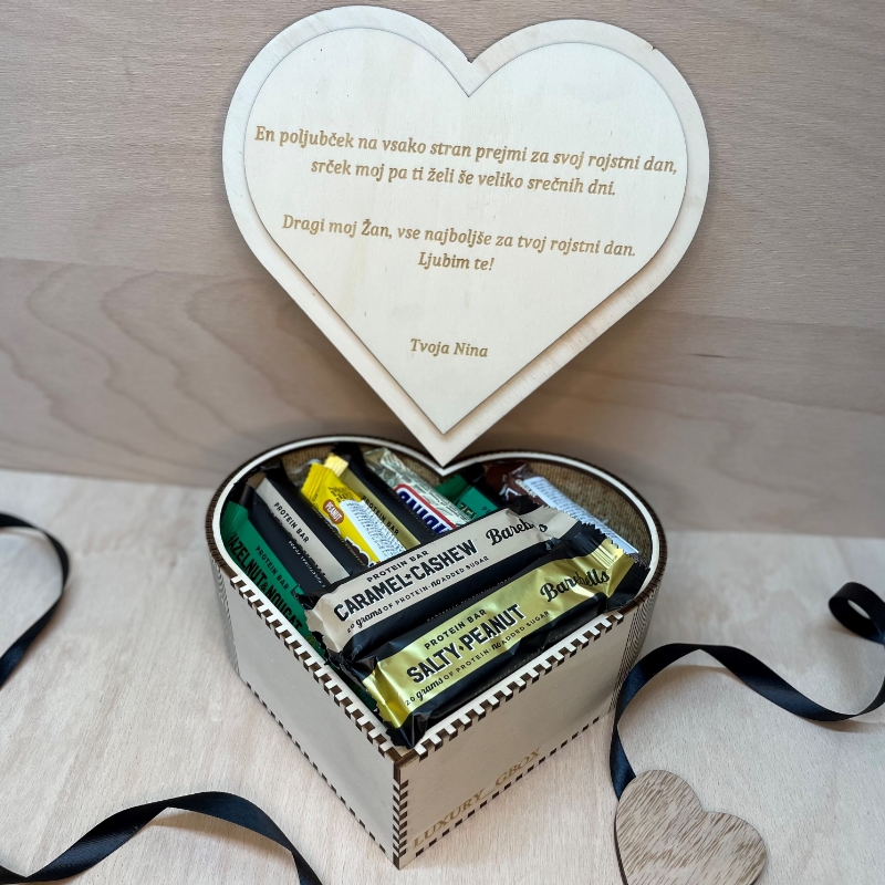 Srček Fit – proteinske paket je ročno izdelan lesen darilni paket v obliki srca, namenjen vsem, ki prisegajo na aktiven življenjski slog in bolj zdrave izbire.